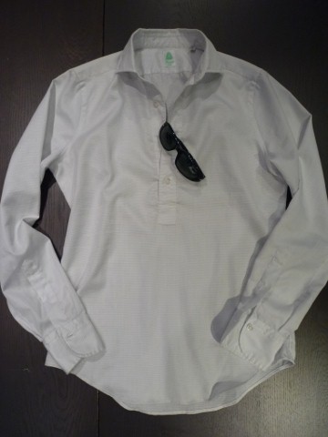 緊急アップします。アルバーノのシャツコーナーの片隅に、ひっそりと置かれていたフィナモレのスポーツシャツ。何故片隅にかと言いますと、皆様お察しの通り数年前に仕入れたものであります。新着情報であげると、ウソつき呼ばわりされます。実は前からブログに書こうと思っていました。モデル名は忘れてしまいましたが、現在のフィナモレのコレクションにはありません。このモデル、衿腰は低いセミワイド、そしてプルオーバーなんです。いろんなブランドからプルオーバーシャツは出ています。しかし、そこは人気フィナモレの独自のテイスト。これは着てみないとわかってもらえないですね。前開きシャツならサラっと羽織ってもらえるのですが、プルオーバーは着にくい為試着される方もいないまま時が過ぎました。サイズは38が2枚。