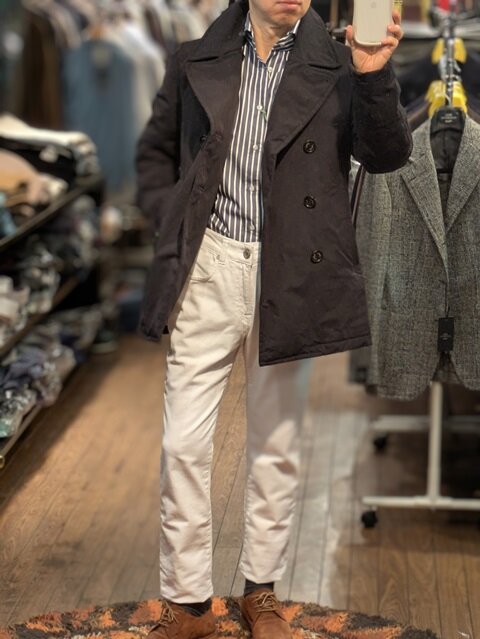 買った時「10年着ます。」と言ったら、当店の相棒から「私なんか20年以上着てるわよ。」と年季の入ったピーコートを見せつけられたヤツ。